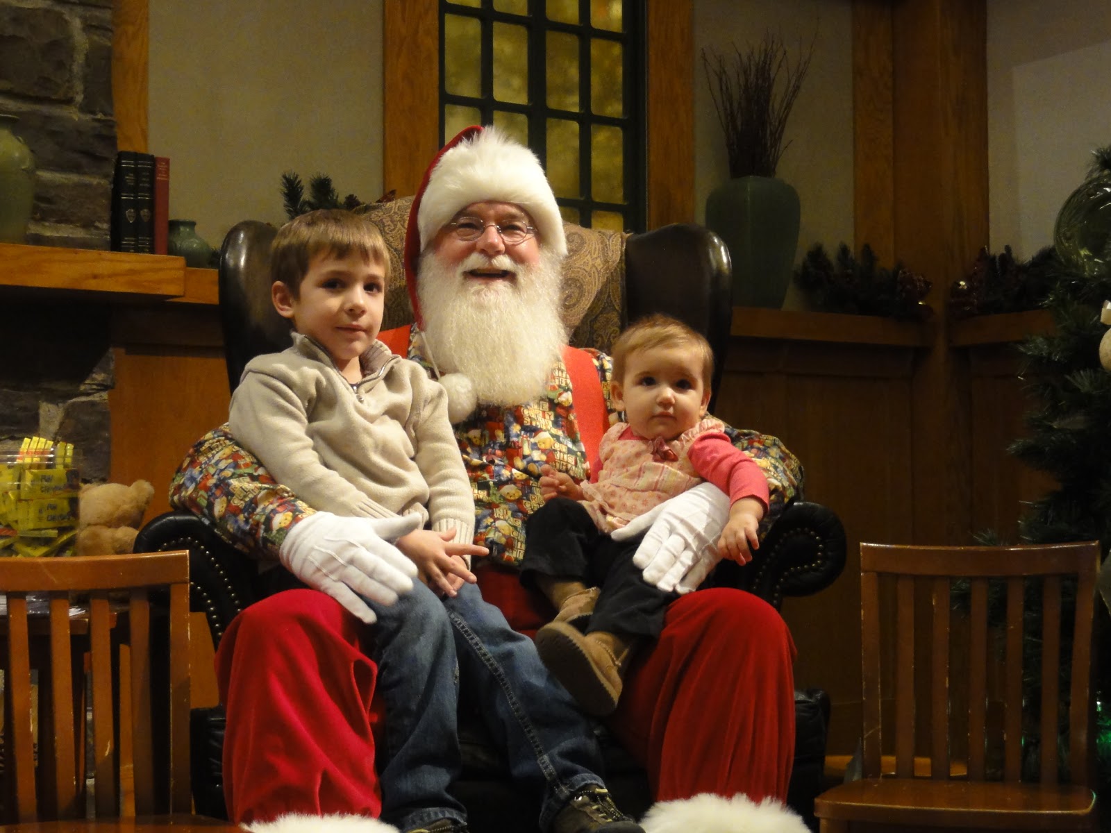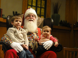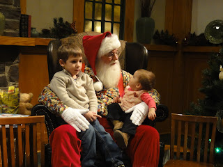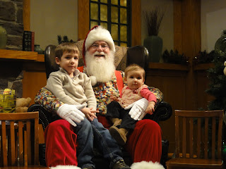 We were able to stop by Santa's house and visit him before Christmas this year. It's amazing that he has such a warm and cozy home right in the middle of a mall!! :) The elves was having technical difficulties with their camera right before we got to the front of the line, but the kids spent the entire time laughing and having a great time while we waited. Brad asked for a race car track while Maddie sat mesmerized by the man with the white beard. Once we were able to un-glue her eyes and detach her hand from his beard (real beard thank goodness), we were able to get a few pictures of our own before Santa gave the kids some coloring books and hugs. It was a lot of fun. There is nothing better than seeing how excited kids get to see Santa every year.